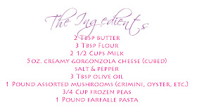 You can prep the cheese and mushrooms beforehand if you want, but I'm a fan of doing everything while I go, so while the butter is melting...I chopped the gorgonzola into chunks. Gorgonzola is a slightly soft, strong smelling cheese. I had to go to Whole Foods to find it, and then had to decide between three varieties! It definitely wasn't an everyday ingredient for me.